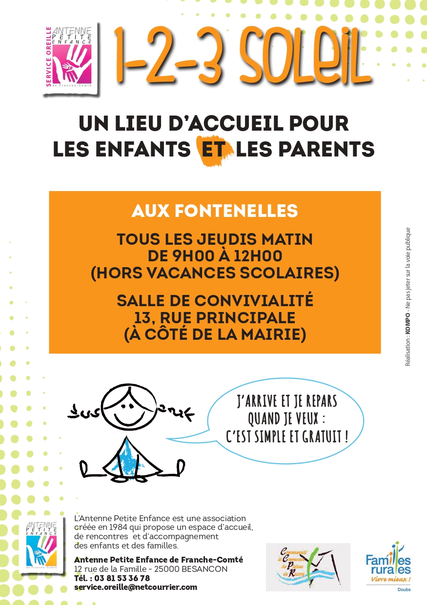 De plus, un Lieu d'Accueil Enfant Parent "1,2,3 Soleil" a ouvert aux Fontenelles. Venez jouer avec votre enfant de 0 à 3 ans tous les jeudis matins, entre 9h et 12h, à la salle de convivialité (à côté de la mairie). Cet espace est accessible gratuitement et sans inscription, à l'enfant en compagnie de son ou ses parents.